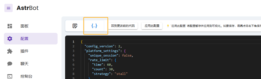 AstrBot 的配置文件是一个 Json 格式的文件。AstrBot 会在启动时读取这个文件,并根据文件中的配置来初始化 AstrBot。它位于 data/cmd_config.json 下。