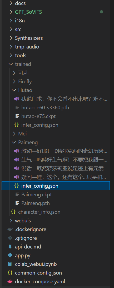 将不同的人物存放至不同的文件夹,GSVI 在读取的人物名称就是 trained 目录下的子目录名称,每个人物文件夹下要包括参考音频,GPT 模型,SoVITS 模型以及推理配置文件(infer_config.json)。 以下是 infer_config.json 的参考配置: