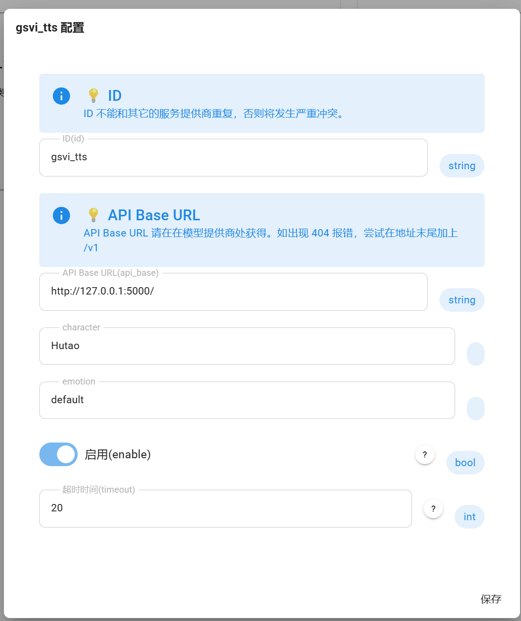 - API base URL:GSVI 服务器地址(本地部署使用默认值即可)